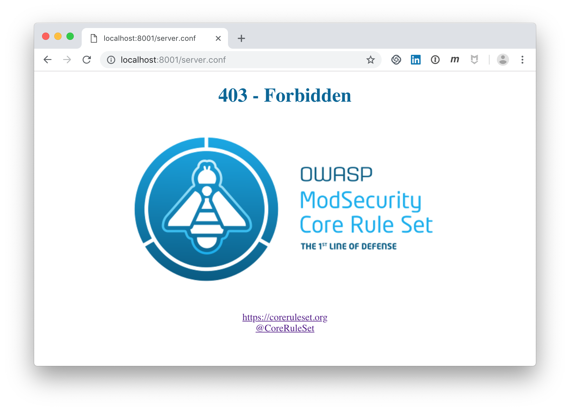 [2018-11-30 15:21:53.786966] [-:error] 172.17.0.1:39830 W-6ykartDdny6dEbaKB05gAAAJE [client 172.17.0.1] ModSecurity: Warning. String match within ".conf/" at TX:extension. [file "/etc/apache2/modsecurity.d/owasp-crs/rules/REQUEST-920-PROTOCOL-ENFORCEMENT.conf"] [line "1069"] [id "920440"] [msg "URL file extension is restricted by policy"] [data ".conf"] [severity "CRITICAL"] [ver "OWASP_CRS/3.0.0"] [tag "application-multi"] [tag "language-multi"] [tag "platform-multi"] [tag "attack-protocol"] [tag "OWASP_CRS/POLICY/EXT_RESTRICTED"] [tag "WASCTC/WASC-15"] [tag "OWASP_TOP_10/A7"] [tag "PCI/6.5.10"] [hostname "localhost"] [uri "/server.conf"] [unique_id "W-6ykartDdny6dEbaKB05gAAAJE"]